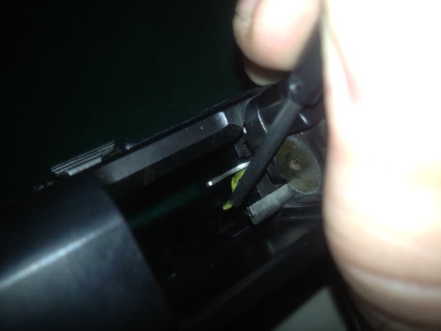 The next step has to be done to remove the slide. Take the point of the Frame Tool and push down the sear (it is the yellow looking piece of metal in the photo below). The sear must be pushed down to remove the slide.